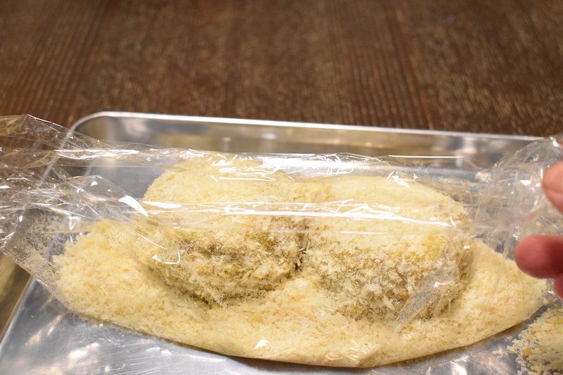 パン粉の下にラップを敷き、写真のようにラップを両手で持ち上げれば、コロッケの側面も簡単にパン粉がつけられます。