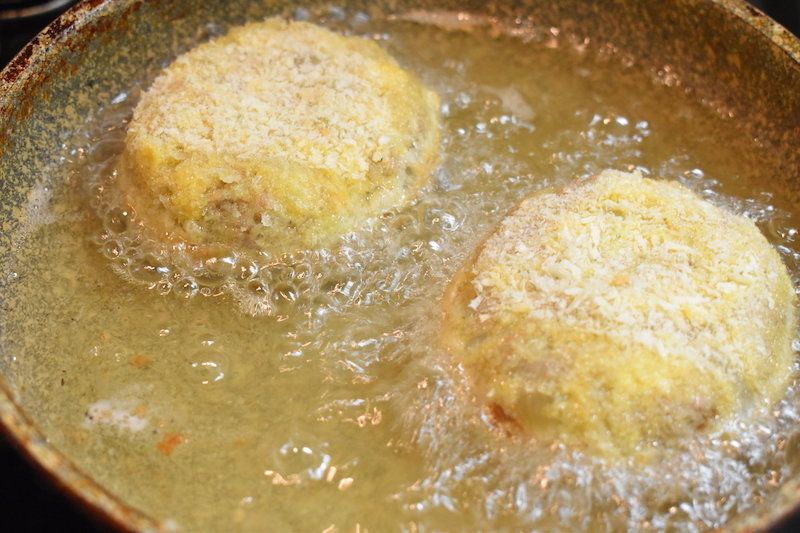 コロッケの具は加熱済みなので、衣に色がつけばOK!揚げ油は1〜2cm程度の少ない油でことたります。やや弱めの中火で、こんがり色づけばOKです。