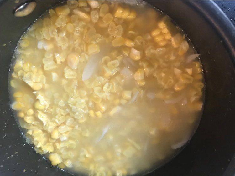 2.トウモロコシを入れて軽く炒め、水、コンソメを入れて、5分ほど蓋をして中火で加熱する。