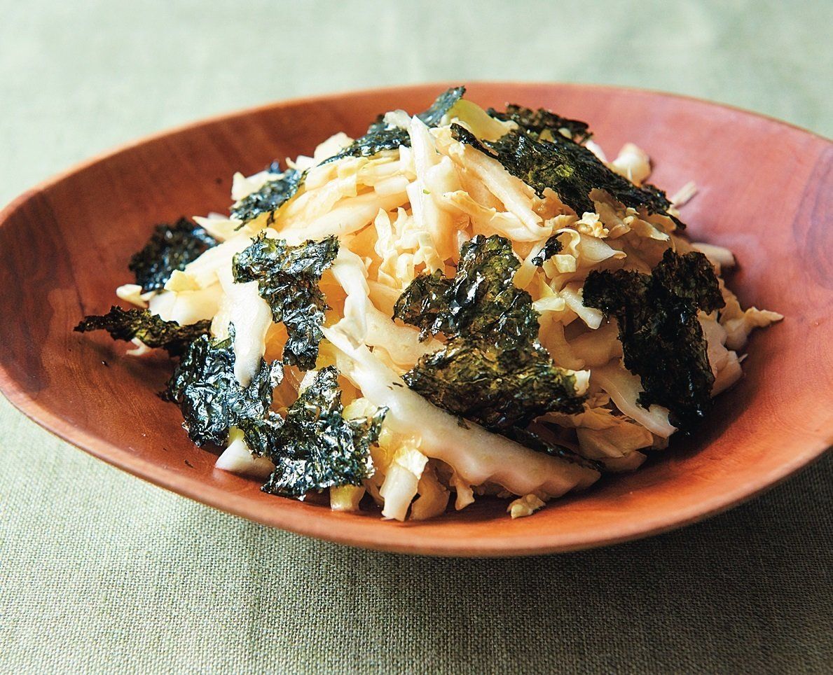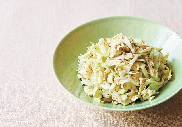 (1)キャベツ300gは長さ5cmの細切りにする。ボウルに入れて塩小1/4をふり、よくもみ込んで水けを絞る。