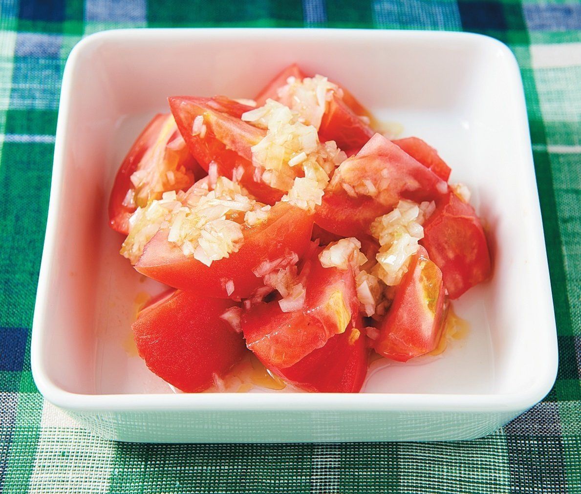 (1)トマト2個はへたを取り、一口大の乱切りにして器に盛る。