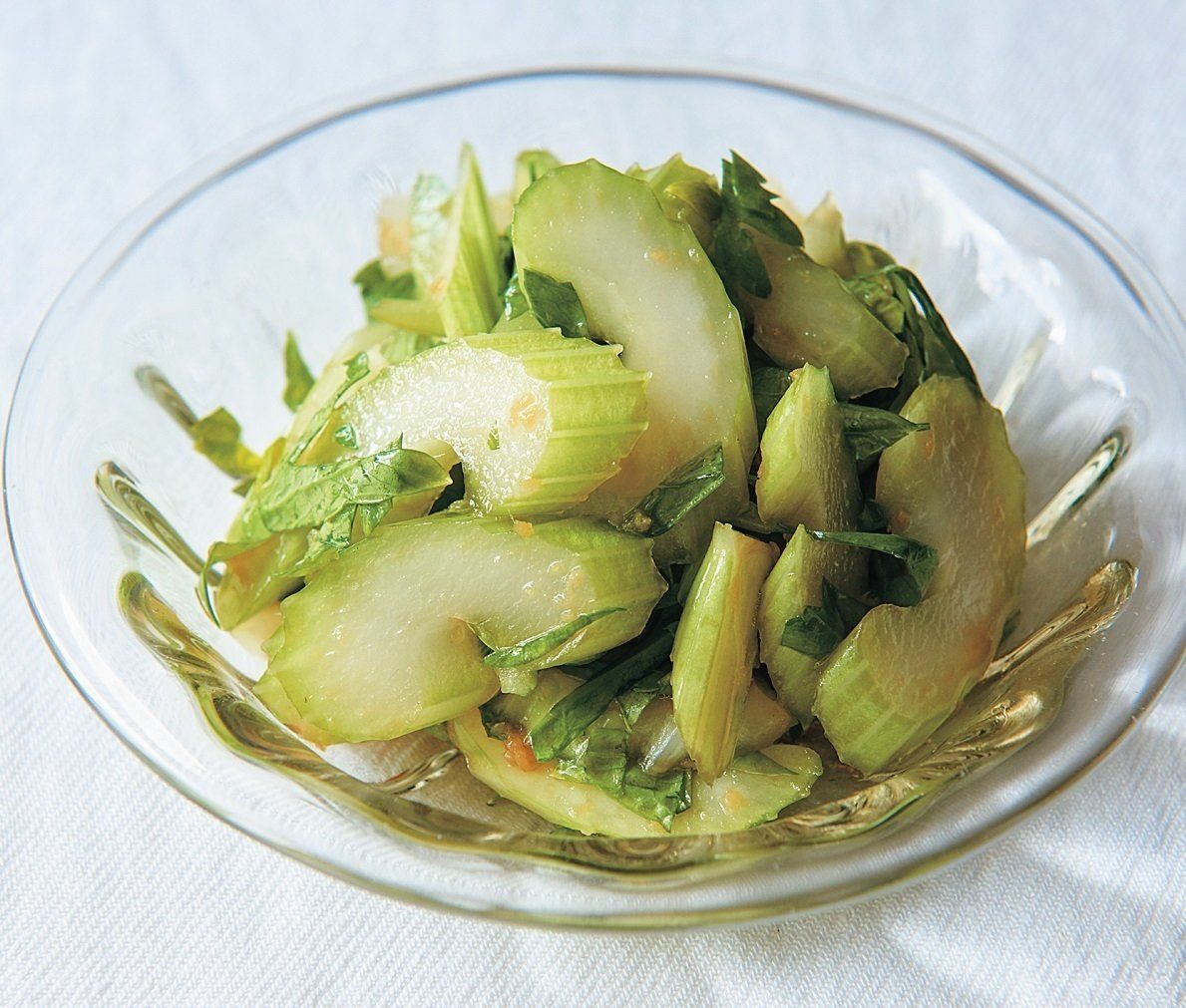 (1)セロリ2本は、茎は筋を取って厚さ1cmの斜め切りに、葉はせん切りにする。