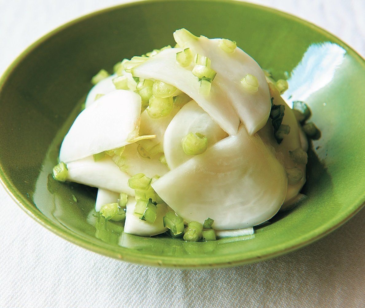 (1)かぶ4個は、実は半分に切って薄切りに、茎は小口切りにする。ボウルに入れて塩小をふり、よくもみ込んで水けを絞る。