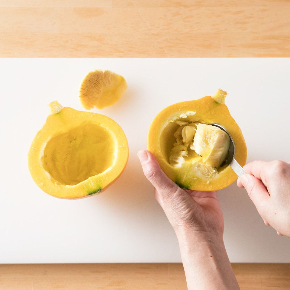 扱いも簡単なんですよ。まずは縦半分に切って、種をスプーンでくり抜くように取り除きます。かぼちゃと同じ要領です。