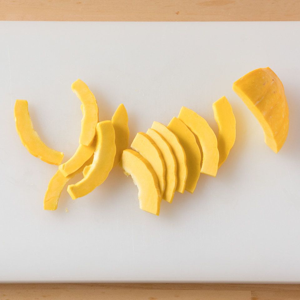 1 コリンキーは皮をよく洗い、縦半分に切る。スプーンで種を取ってさらに縦半分に切り、1〜2mm厚さの薄切りにする。