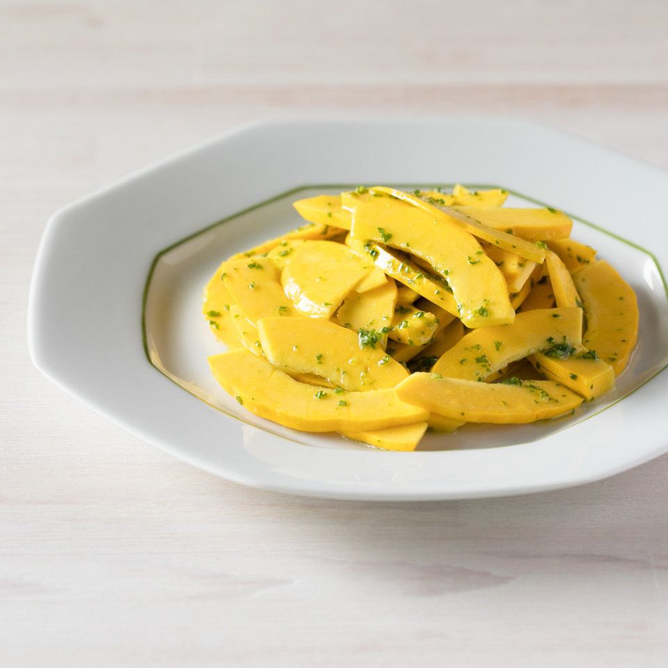 そして、かぼちゃとは思えない、シャクッとした歯ごたえと、甘くないフルーツのようなみずみずしさが夏にぴったりの一皿になる気がします。
