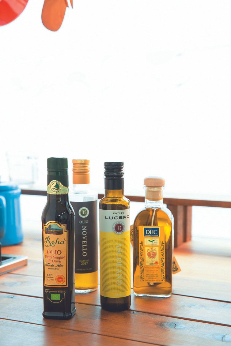 キッチンには、こだわりのオリーブ油が並んでいます。風味の違いを楽しみます