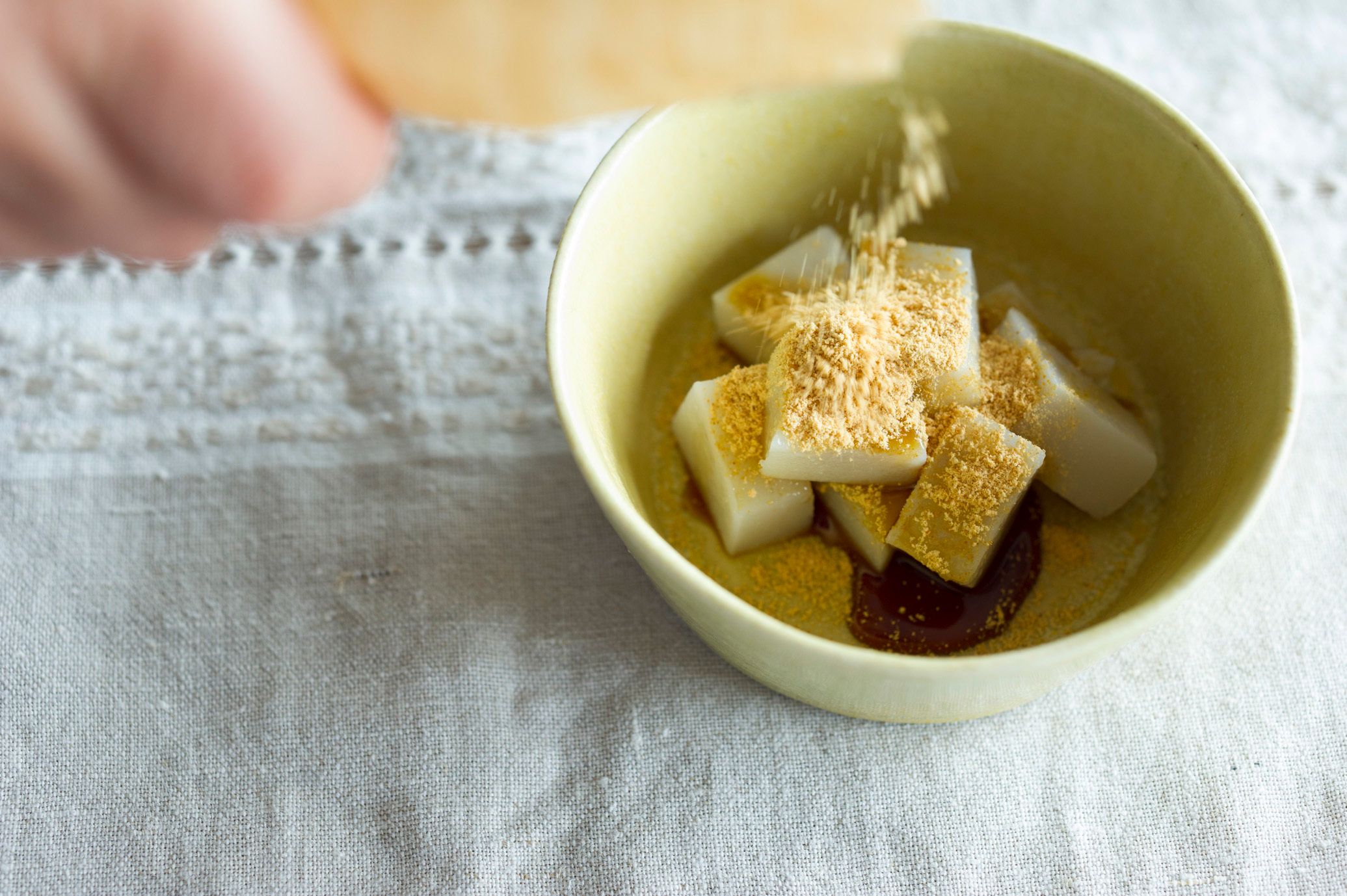 6歳の娘用には深めの器に入れ、きな粉をたっぷりとふりかけて。