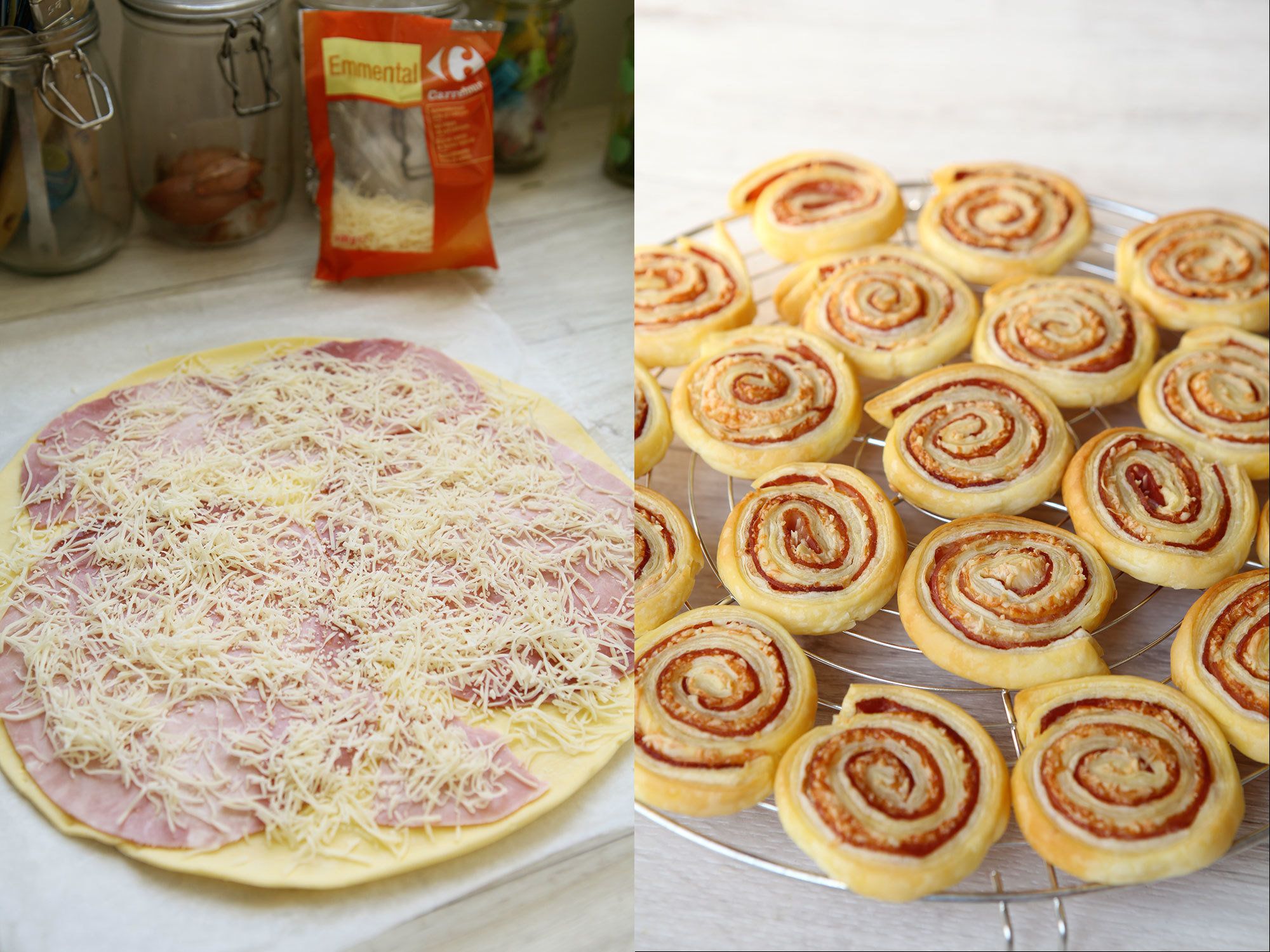 初めて友人の家で教えてもらったときは最もシンプルなバージョン「ハム&チーズ」のみ。広げたパイシートにハムとピザ用のとろけるチーズをのせてクルクル巻いて輪切りにしたものをオーブンで焼く(200度で15分くらい)だけです。
