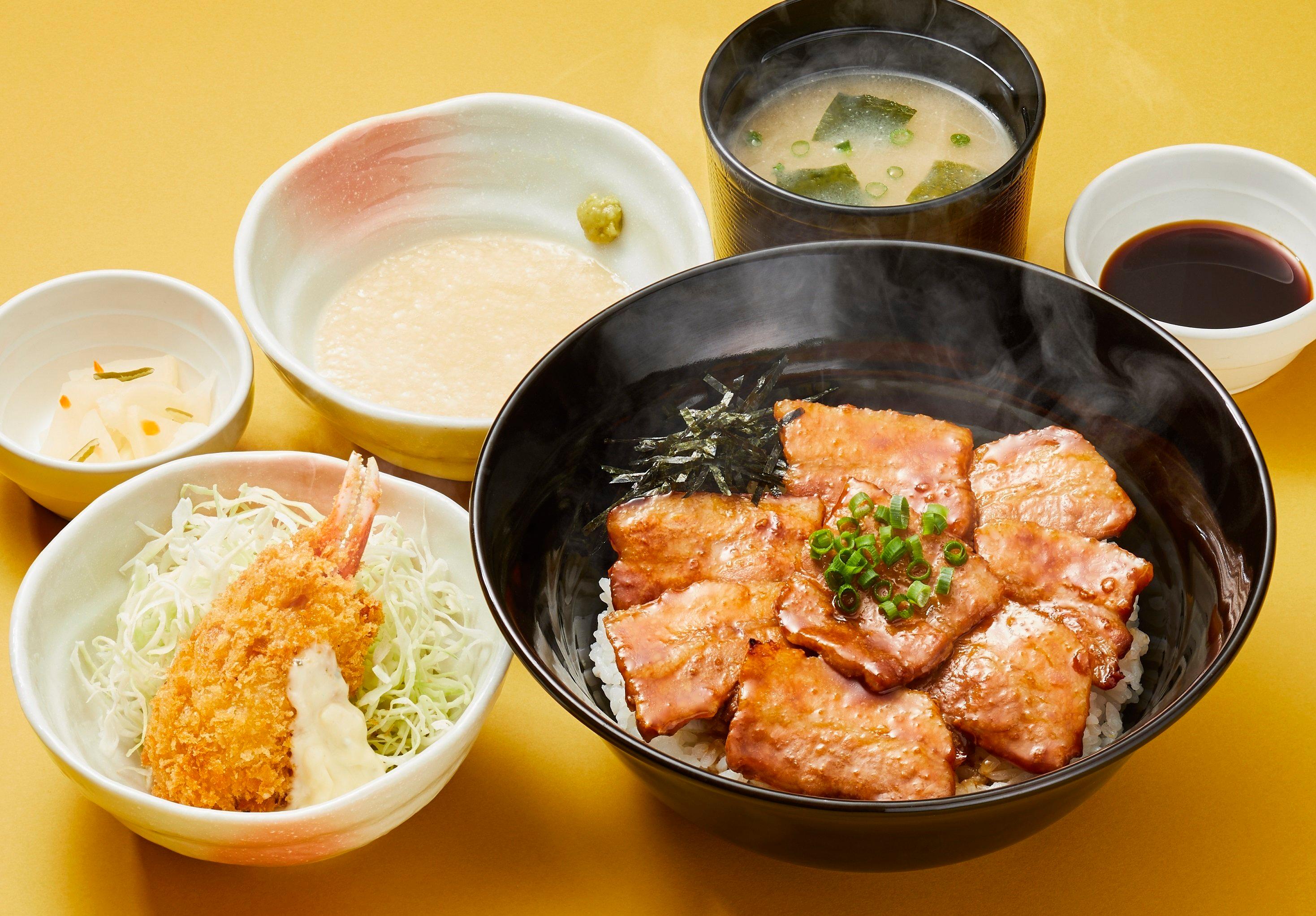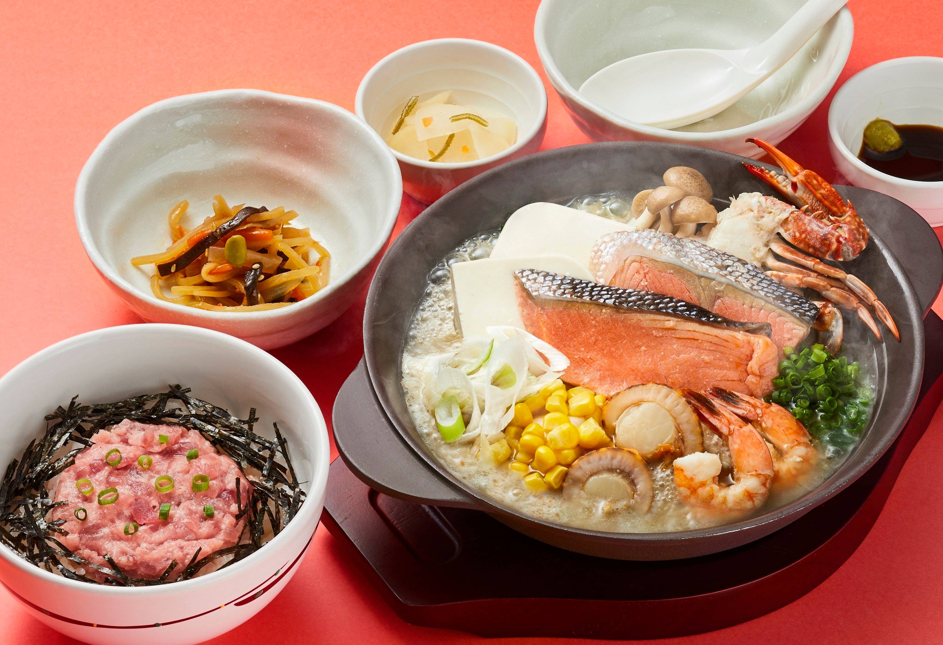 「石狩風鍋とミニねぎとろ丼和膳」は、北海道で親しまれる“石狩鍋”をイメージしたメニューです。脂のり抜群の銀鮭、ぷりっとした食感と甘みが特徴の陸奥湾帆立に加え、海老やカニなどまさに冬の海の幸のオールスターが一堂に会したあつあつの鍋料理です。白みそベースのスープが海鮮の旨味がたっぷりと滲み出ることによってさらにコク深い味わいへと昇華し、冷えた身体にも染み渡る冬にぴったりのメニューに仕上がりました。そのほかにも、別添のとろろをかけることで“味変”を楽しめる帯広風豚丼や、やわらかくなるまでじっくり煮込んだ厚切りの牛たんがごろごろと入った濃厚シチューなどが集結します。