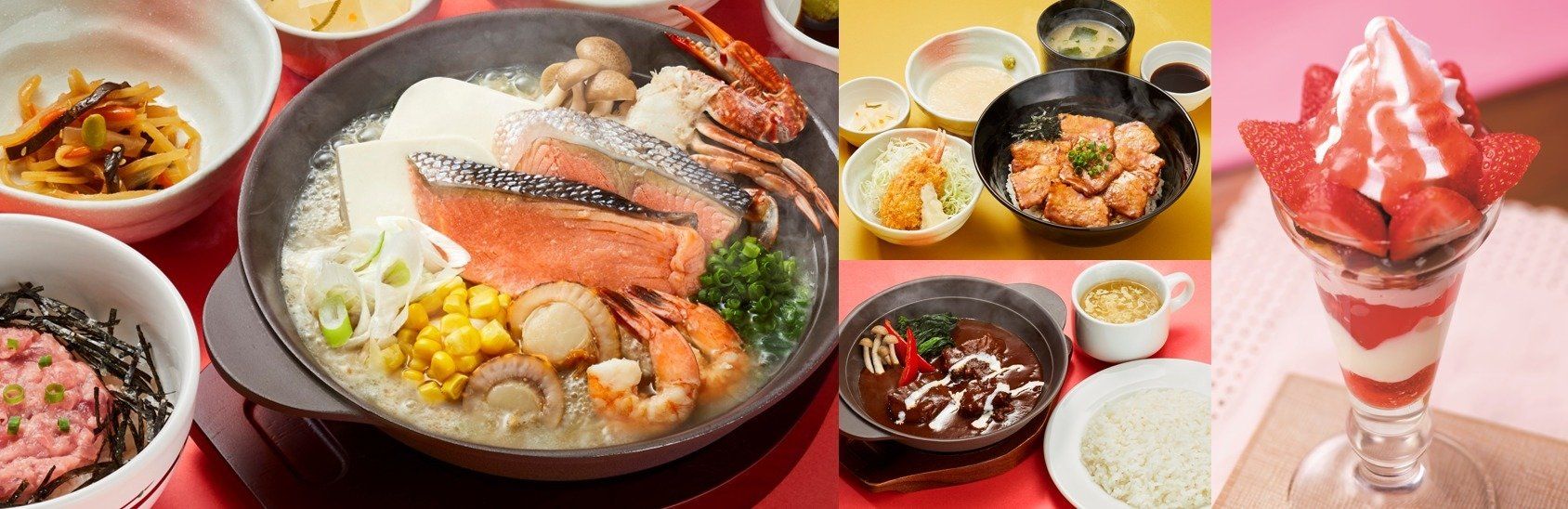 またスイーツには、これからの時期が美味しい、ジューシーでフレッシュないちごを使用したメニューが登場。濃密な北海道ソフトやいちごをはじめとした具材が幾重にも重なり、食べ進める度に新たな味わいを楽しめるパフェに加え、あたたかいぜんざいとソフトクリームが融合した“ひやあついちごスイーツ”など、この時期ならではのラインナップをご用意しています。