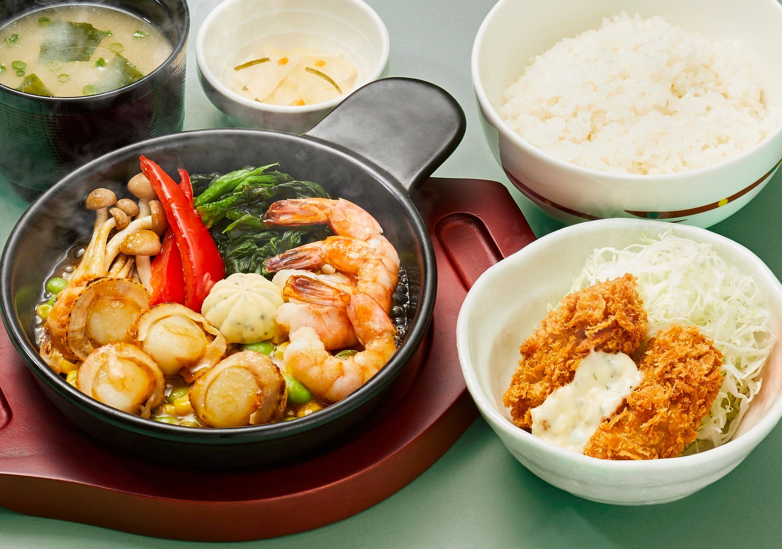 3. <青森> 陸奥湾帆立と海老のグリルとカキフライの和膳[ご飯・味噌汁・漬物付き] 1,099 円