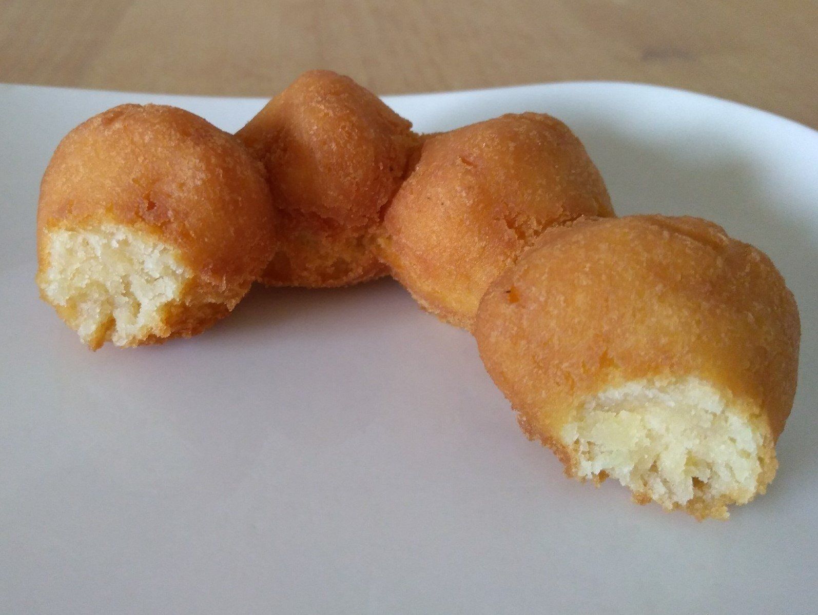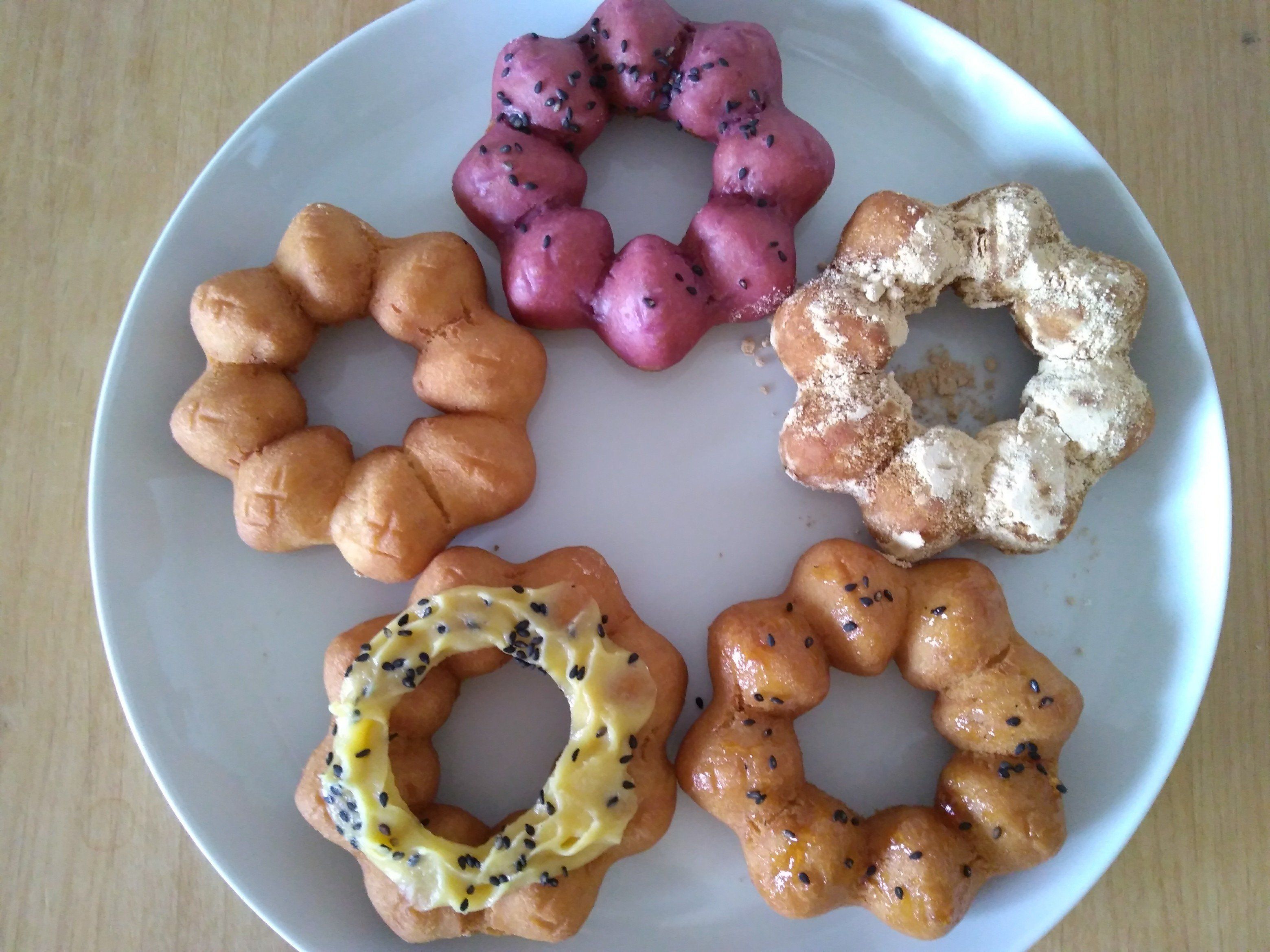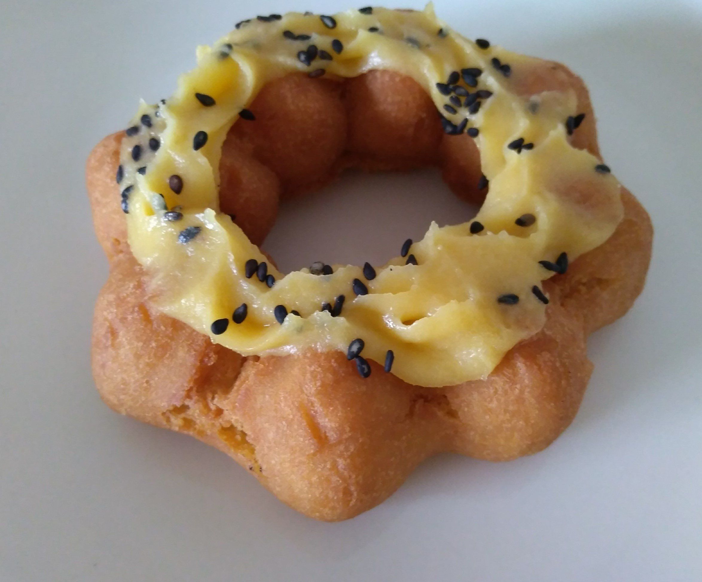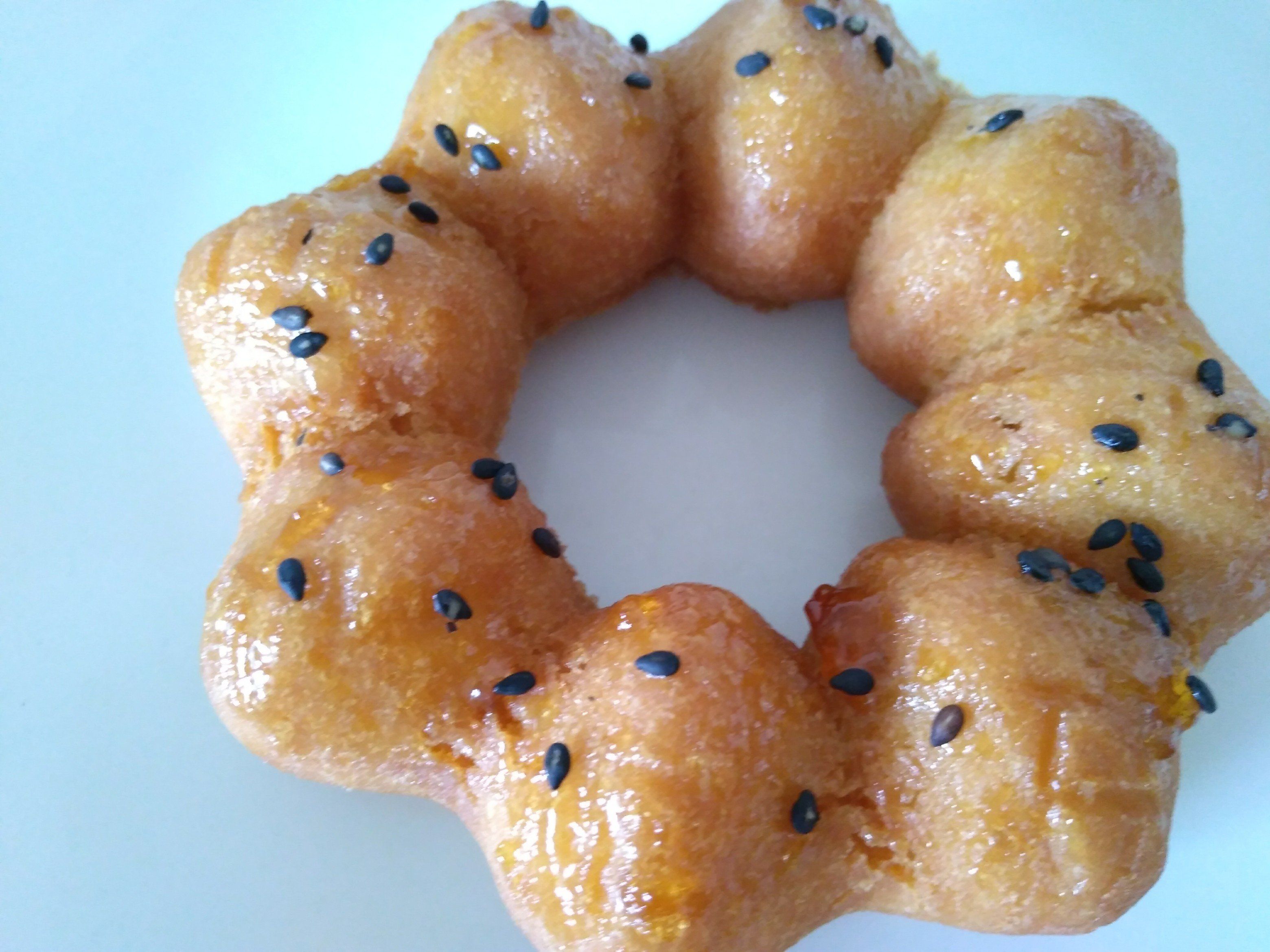 見た目は「ポン・デ・リング」のようですがぜんぜん違って、タイプでいったら「オールドファッション」を軽くソフトにしたような生地です。ほろっとしっとり、焼きいもっぽい感じもします。