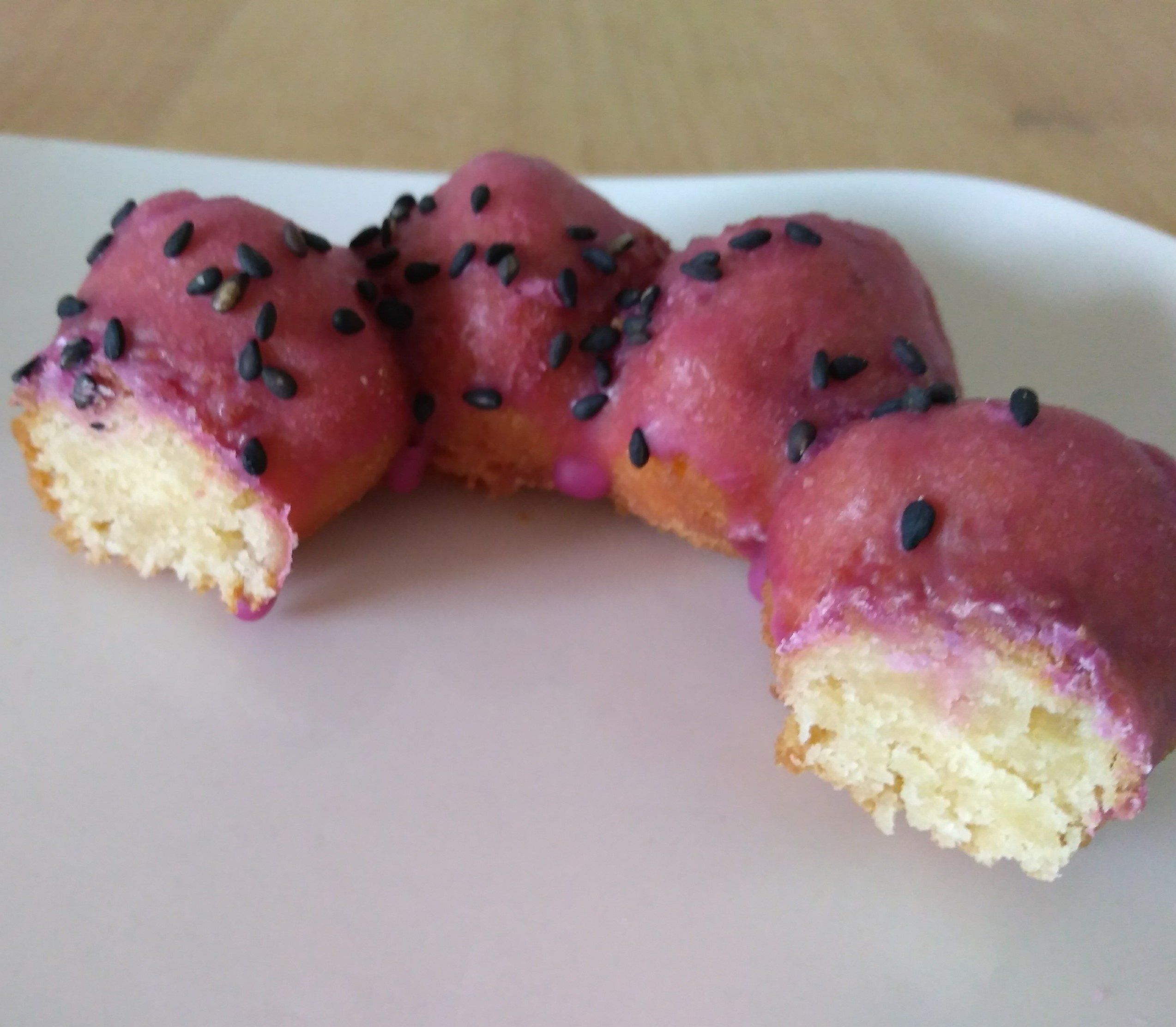 紫いもグレーズの効果もあって、プレーンよりも甘みはしっかり。また、プレーンとは違う紫いもらしいほっこりした風味も感じました。黒ごまもいいアクセント。
