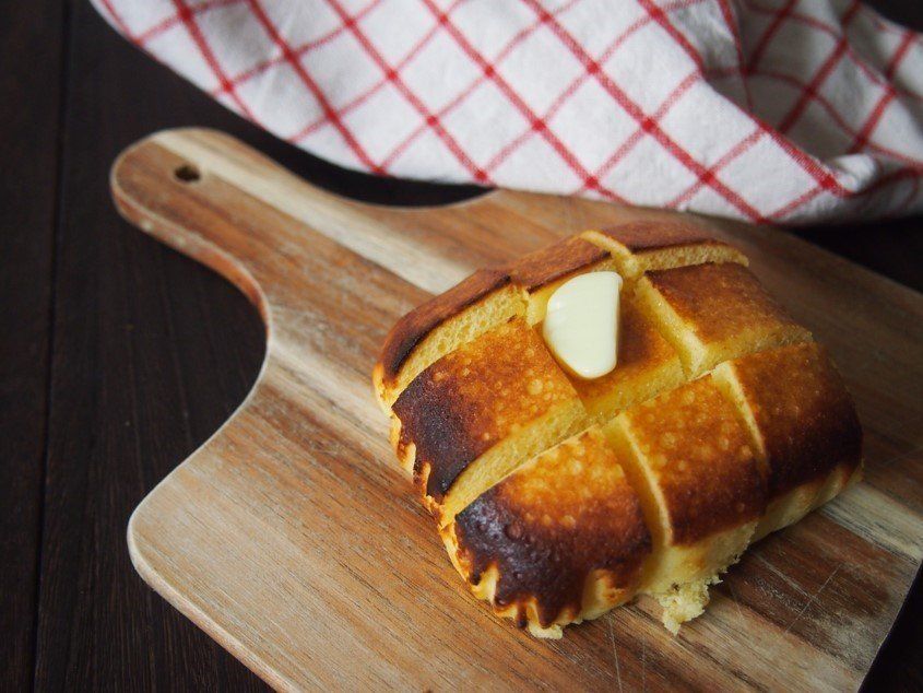 熱でじんわりとバターがとけて、切り込みにじゅわっと流れ込んでいきます。バターがすべて溶け切ってから食べると、プルンッとした食感を楽しめます。有塩バターの塩っ気とパンの甘さが合わさった、甘じょっぱさがいい塩梅です。