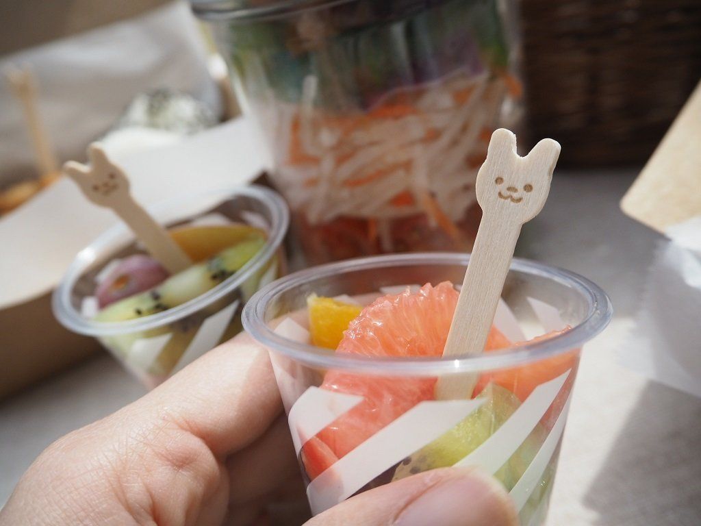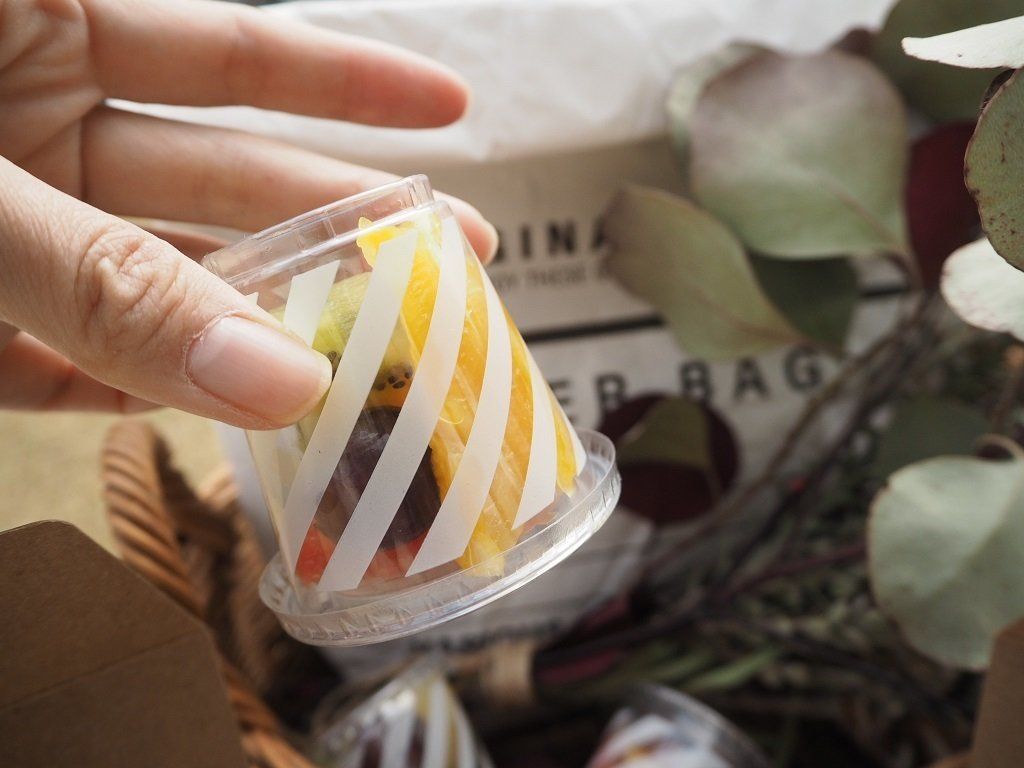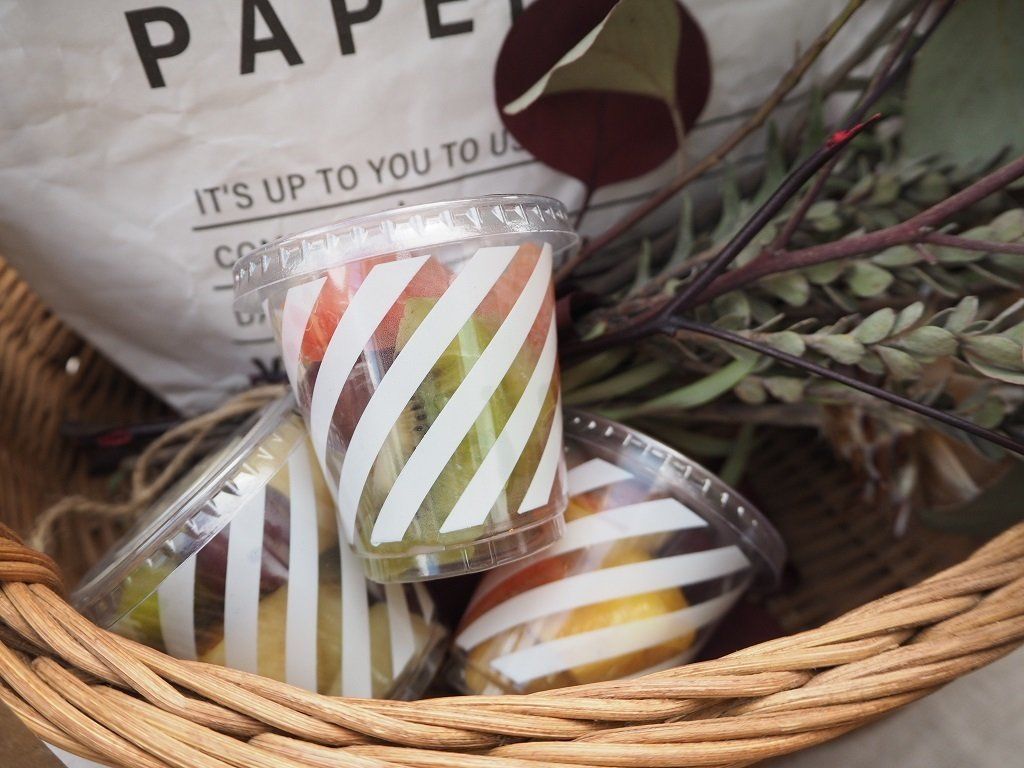ふたつきのフードパックは、しっかりとふたが閉まってくれるので、汁もれなどの心配のあるフルーツも安心して持っていけます。フルーツがあるとオシャピクの写真も一気に華やかに!フードパックの柄がかわいいのもうれしいポイント。