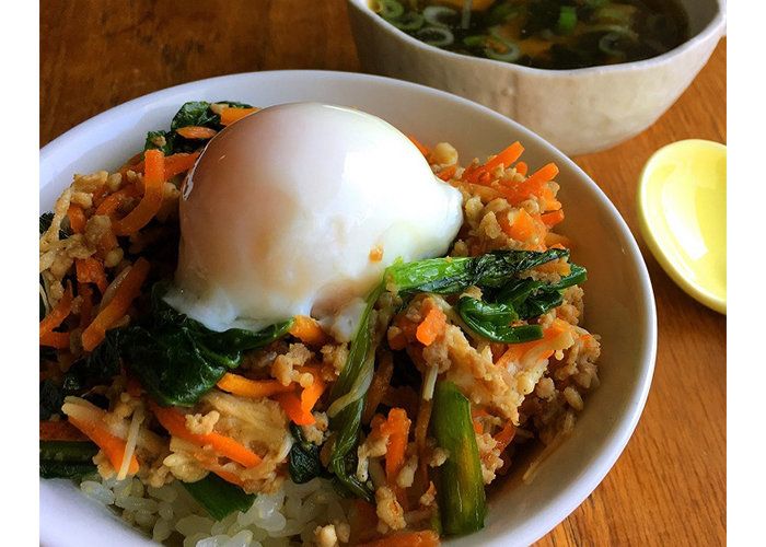 【2日目】ジューシーそぼろと野菜のビビンバ&長ネギと海苔、豆腐の韓国風スープ