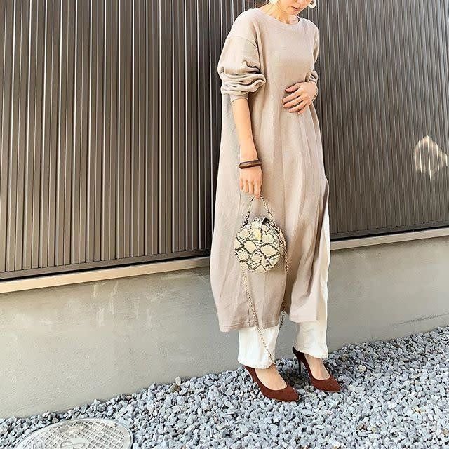 チェーンつきのバッグを「ワントーンコーデ」にプラスすれば、アクセサリーの役目も果たしてくれますし、金属パーツがぼんやりしがちなワントーンスタイルにキレを与えてくれますよ。