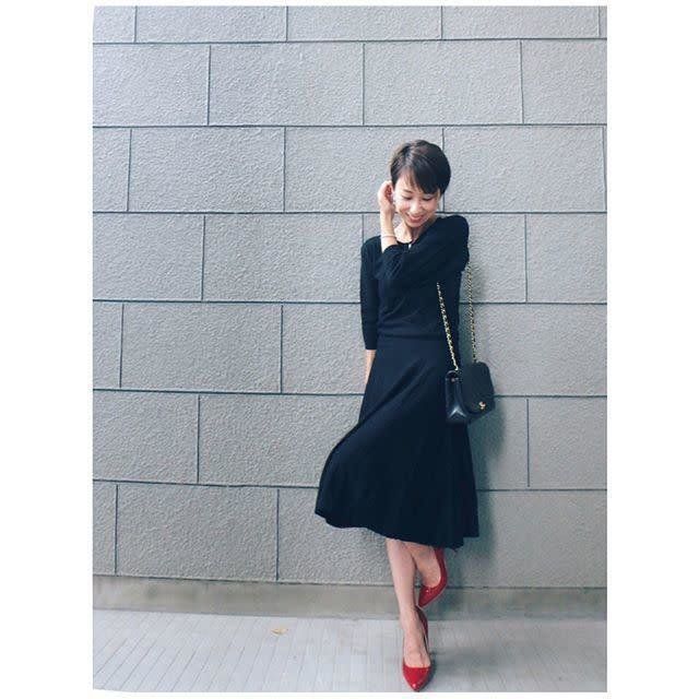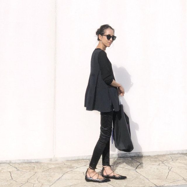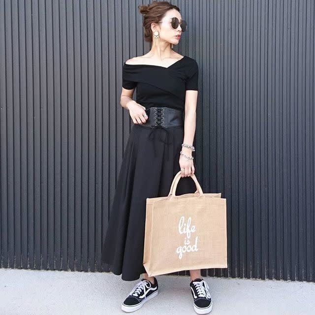 こちらの写真も、オールブラックで重く見えがちなスタイルを、大きくあいたネックラインでキレのあるワントーンコーデに仕上げています。足元をスニーカーでカジュアルダウンすれば、今どきらしい旬なスタイルに。