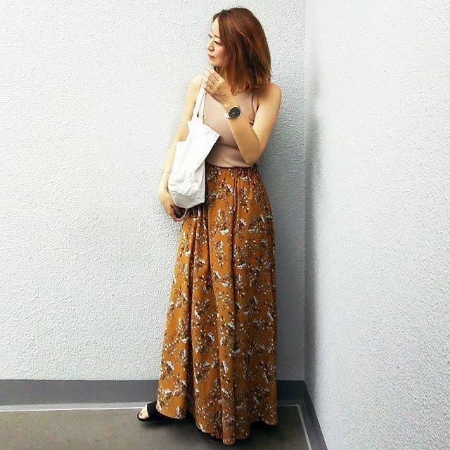 写真のようなトレンドのロングボトムスで柄をオンすれば、シンプルアイテムの組みあわせでも、地味な印象に終わらず、上品さも適度な華やかさもある装いに。ふだん柄が苦手な人も、ワントーンコーデならトライしやすいかも。