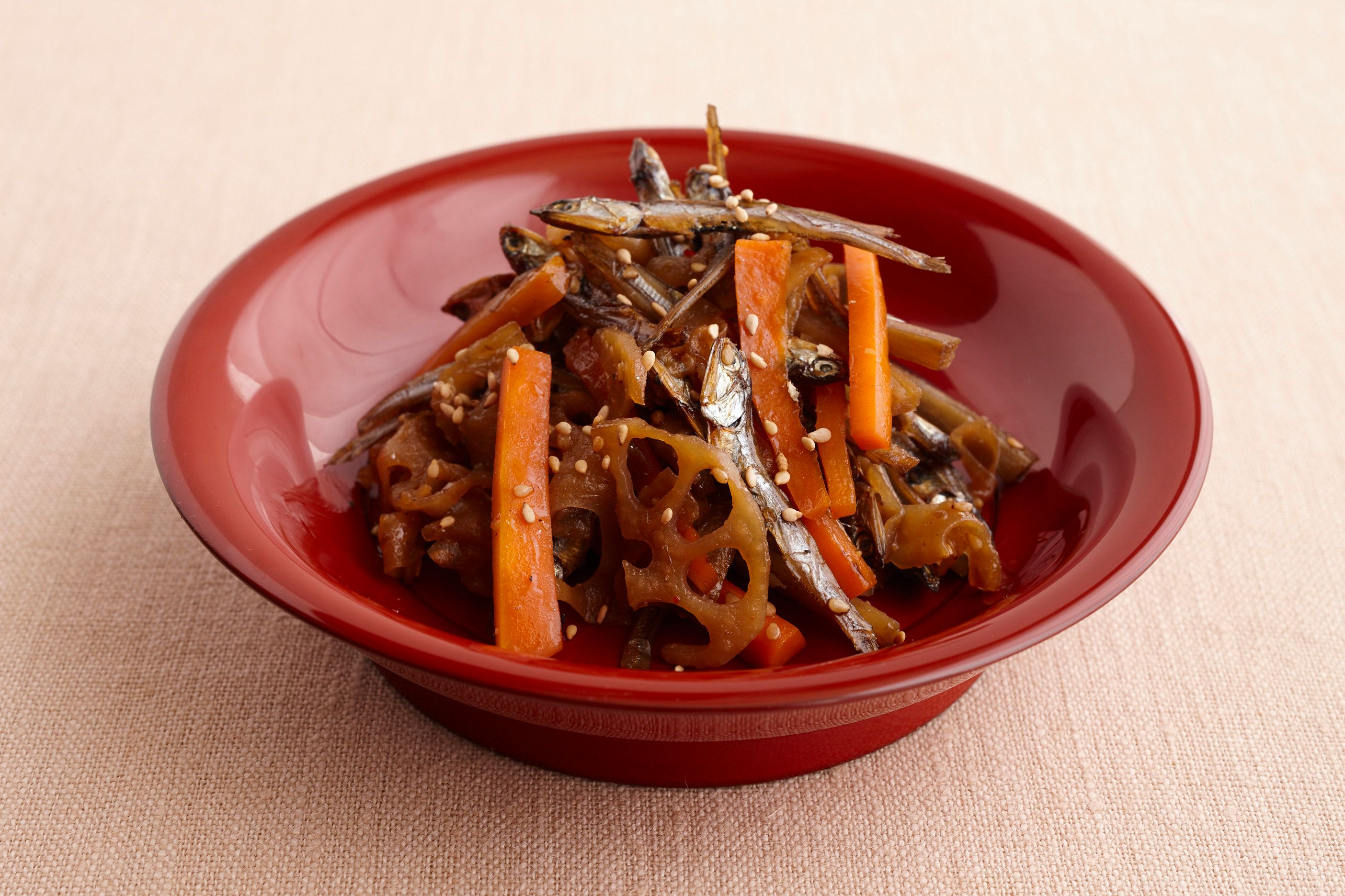 ごぼう……100g にんじん……100g れんこん……100g ごまめ……50g 白いりごま……大さじ1 一味唐辛子……少々 ごま油……大さじ2