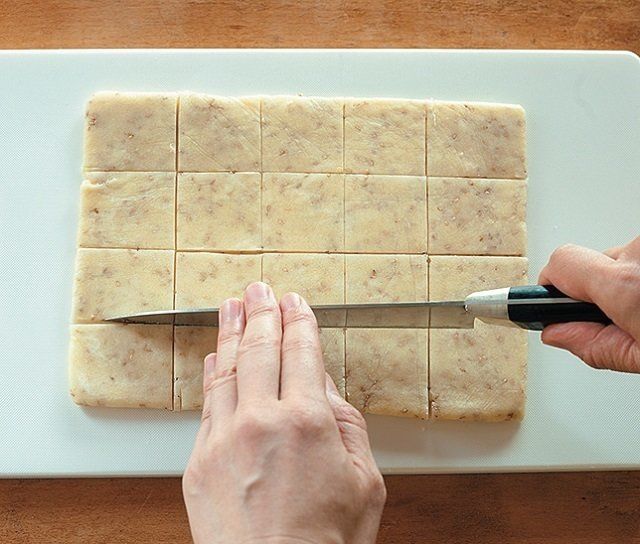 2.ラップ(長さ45㎝くらい)で をはさみ、めん棒で20×16㎝にのばす。約4㎝四方に包丁で切り、オーブン用シートを敷いた天板に並べる。