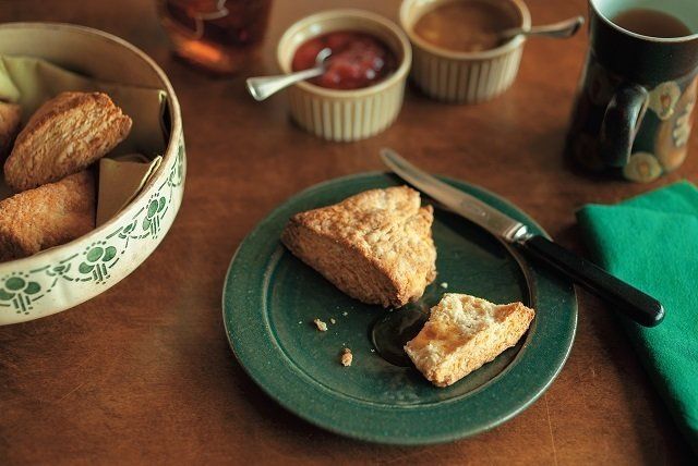 3.2をまな板の上で厚さ1.5㎝の円形にまとめ、包丁で放射状に6等分に切る。天板にオーブン用シートを敷いて並べ、180℃に予熱したオーブンで20分焼く。
