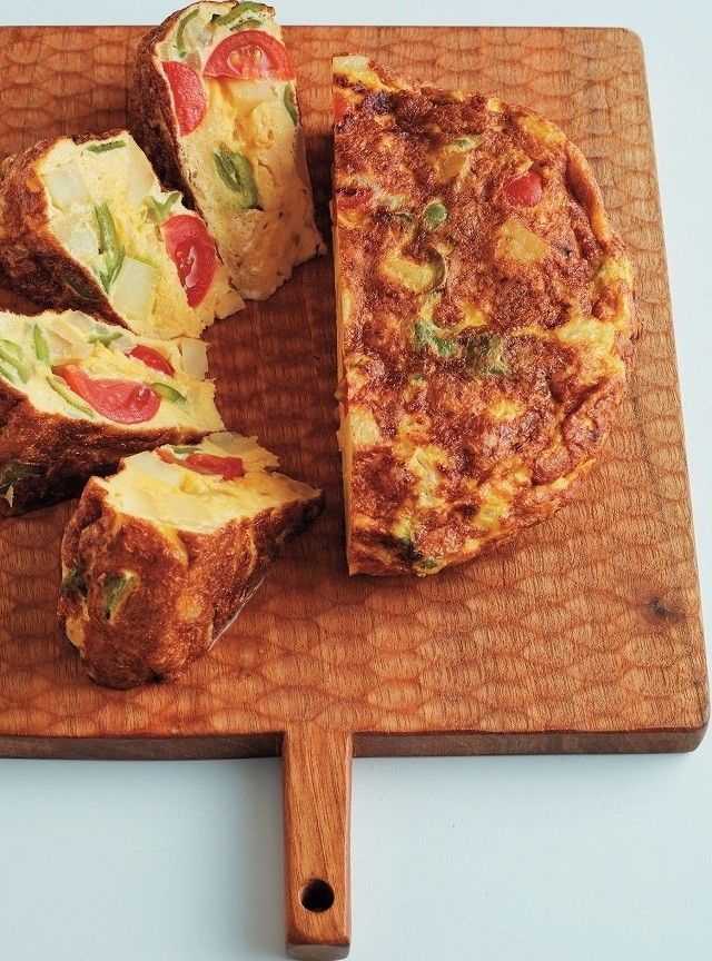 4. 2のフライパンに残りのオリーブ油を入れて強めの中火で熱し、3を流し入れる。へらで大きく混ぜながら全体を半熟にする。火を弱火にし、ふたをして3~4分焼く。皿やまな板を利用して裏返し、もう一度ふたをして3~4分焼き、粗熱を取って切り分ける。 (174kcal)