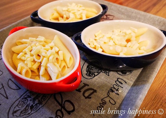 ペンネのチーズ焼きは長男くんが担当。こちらも器にペンネを入れてチーズをのせるだけと簡単。