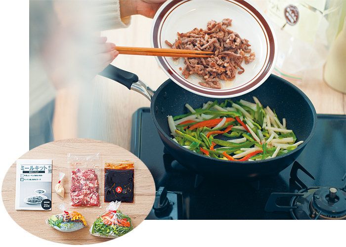 家についてミールキットを開けてみると、カット済みの食材が。「包丁いらずで、炒めるだけだから本当に簡単〜! これなら料理が苦手なパパにも夕食作りをお願いしやすそう」と、長田さん。レシピ付きなので、迷わず調理できるだけでなく、調合済みの調味料も付いているので味付けも簡単に決まります。