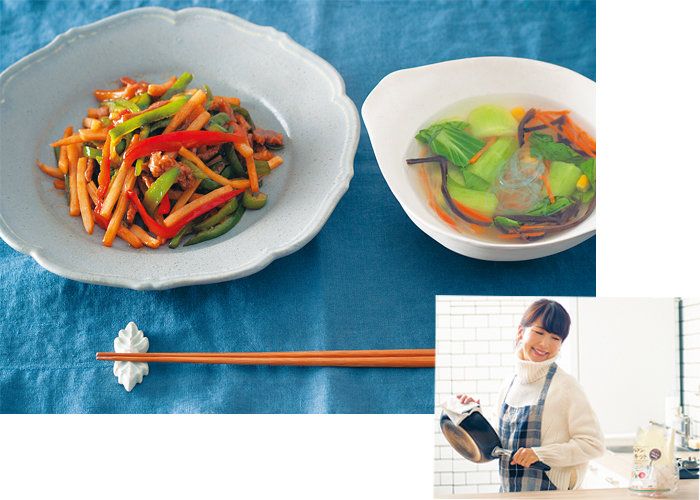調理スタートからたった20分でおいしそうな主菜&副菜の晩ごはんが完成! ボリュームも彩りも大満足の仕上がりです。「赤パプリカは使い切ることが難しく、あまり買わない食材。こうして取り入れられるのがうれしい!」。