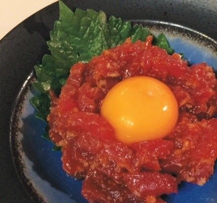 特売のまぐろをたたき、姜葱醤と焼き肉のたれであえただけ。薬味を入れなくても、これだけで充分。どんぶりにしても!