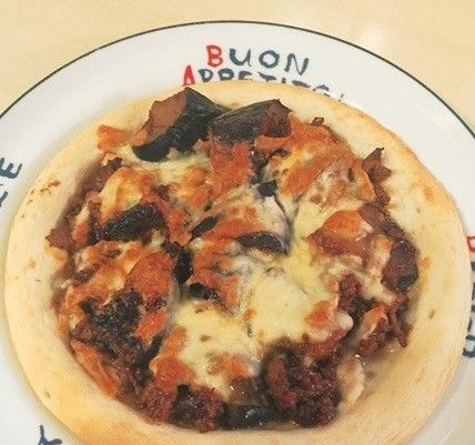 業スーのピザクラストに、炒めたひき肉と揚げなすをトッピングすれば包丁いらずでお店の味に。もちろんミートソースの具にも。