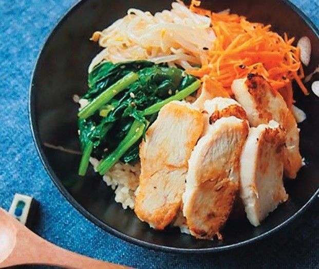 サラダチキンはごま油でサッと焦げ目をつけて、ナムルと一緒にご飯にドン!塩味がしっかりついているので、味つけいらず。