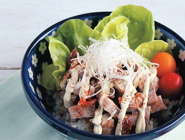 レタス、煮豚、しらがねぎをご飯にのせてマヨネーズをかければ、こってり系のどんぶりに。たれも残さず使います。麺類とも合う!