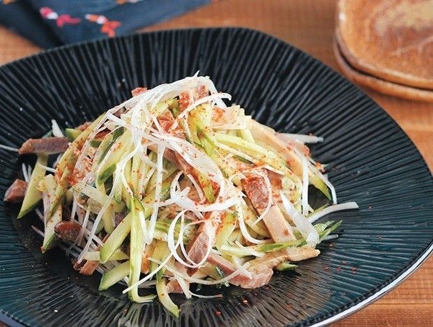 きゅうり、ねぎを加えて、しょうゆ、酢、ごま油、砂糖で作ったドレッシングであえるだけ。葉もの野菜やゆで卵とも相性◎。