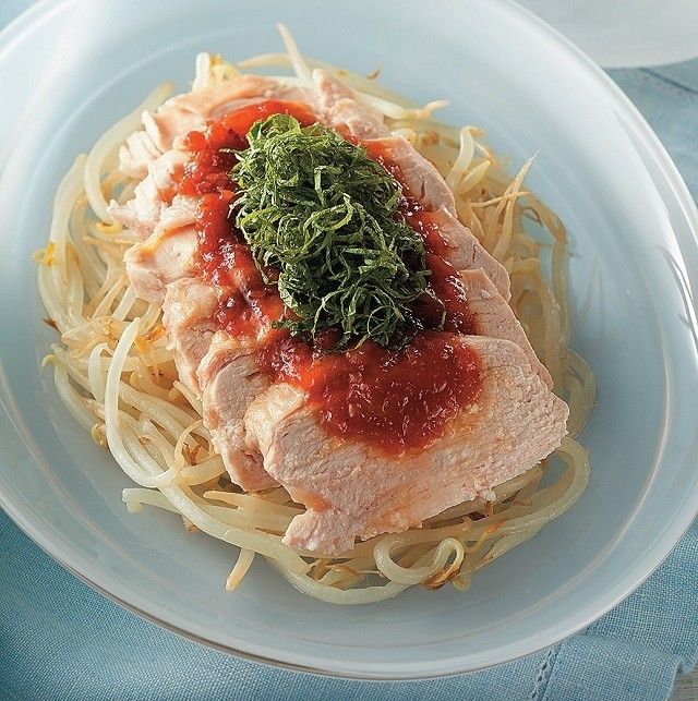 鶏胸肉2枚は塩小⅓、酒大2をもみ込んで10分おき、電子レンジで2分加熱後、もやし2袋を加えてさらに3 ~ 4分加熱して盛りつける。みじん切りにした梅干し4個分、ごま油大2、しょうゆ、はちみつ各小2を混ぜ合わせてたれを作り、好みで青じそをのせる。