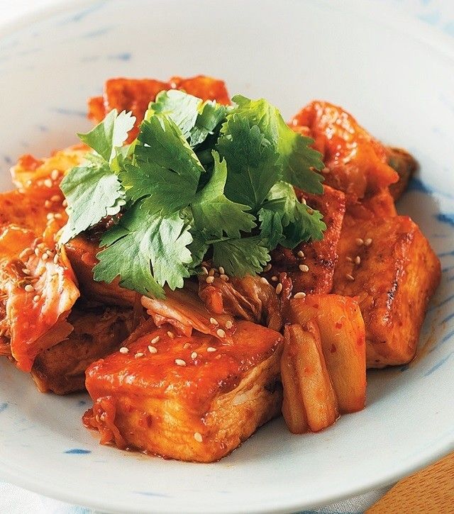 一口大に切って片栗粉小2をまぶした木綿豆腐600gは、ごま油大1を中火で熱したフライパンで表面を焼き、キムチ120g、オイスターソース小4、みそ小2を加えてサッと炒める。好みでパクチー30gをのせ、白いりごまをふる。