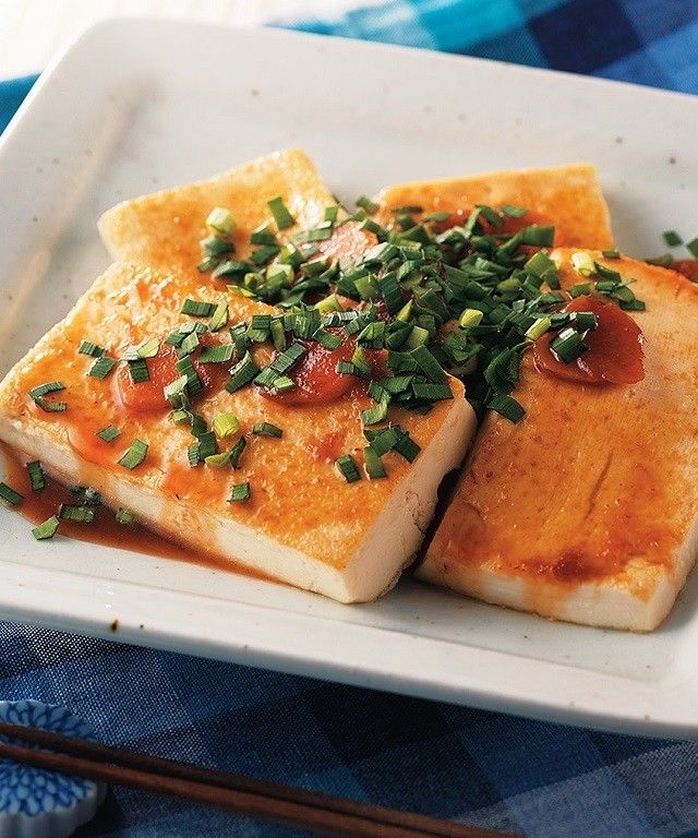 オリーブ油大1を中火で熱したフライパンで、薄切りにんにく4かけ分を炒めて取り出す。半分の厚さにして4等分し、片栗粉小2をまぶした木綿豆腐600gの表面を焼いて器に盛る。にんにくを戻し、水大4、酒大2、しょうゆ小4、はちみつ小2を煮たたれをかけ、刻んだにら6本分を散らす。