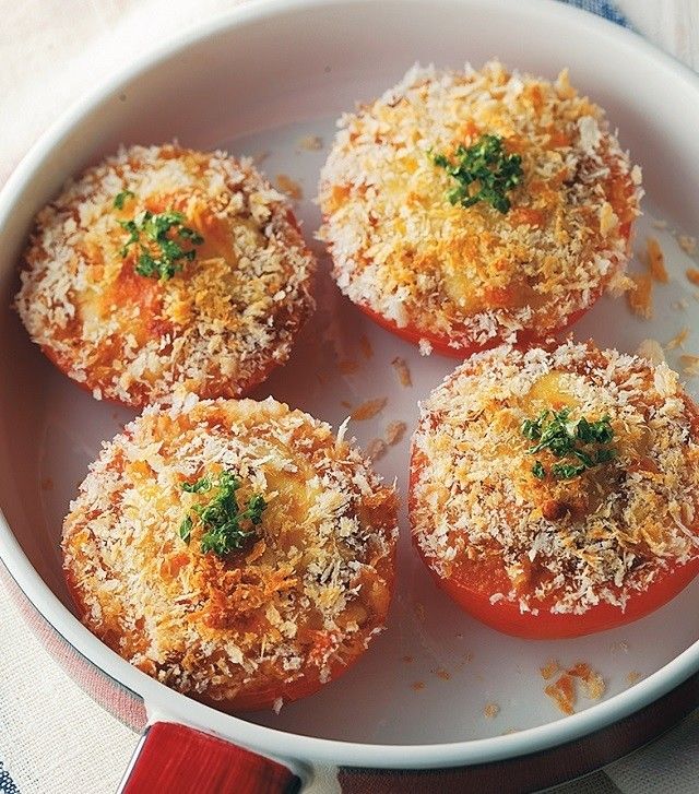 トマト4個は横半分に切り、上下を少し切り落とす。みそ大1、オリーブ油小2、にんにくのすりおろし小½ を混ぜて表面に塗り、ピザ用チーズ60gをのせ、パン粉大6をふる。オーブントースターで約2分焼き、表面に焼き色がついたらアルミホイルをかぶせてさらに8分焼き、好みでパセリを散らす。