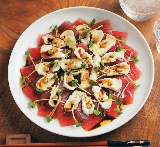 まぐろとカマンベールチーズは薄切りにして重ね、わさびをのせて貝割れ菜を散らす。しょうゆ、バルサミコ酢(または、酢と砂糖を混ぜる)、オリーブ油で作ったソースをかける。