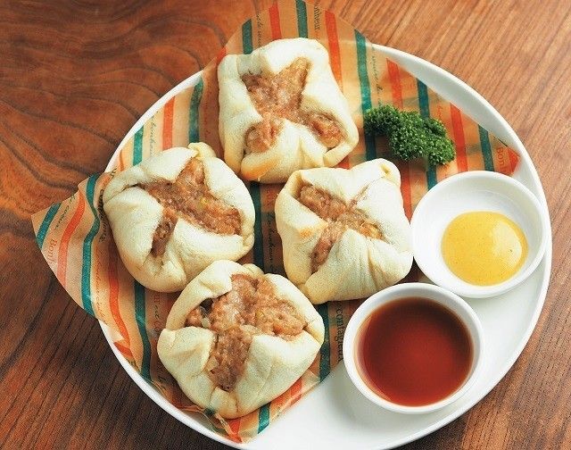食パン(8枚切り)は、みみを切り落として水で湿らせてラップにのせ、ひき肉や玉ねぎで作った肉だねをのせてラップで茶巾しぼりにする。耐熱皿に並べて水少々を入れ、ラップを掛けて4個当たり電子レンジで7~8分加熱する。