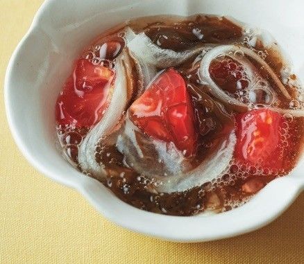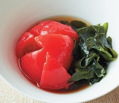角切りにしたトマトと薄切り玉ねぎ、味つきもずくを混ぜる。 蒸し暑い夏にピッタリなさわやかな組み合わせ。