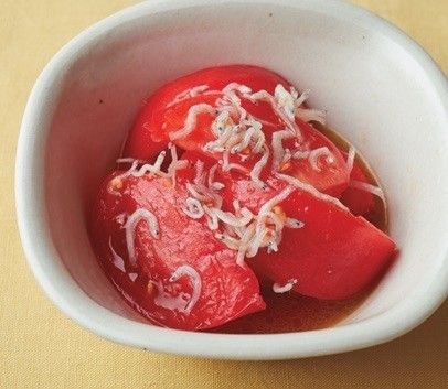 くし形切りしたトマトにちりめんじゃこ、酢、オリーブ油、塩、こしょうを混ぜる。じゃこの塩味がアクセント。
