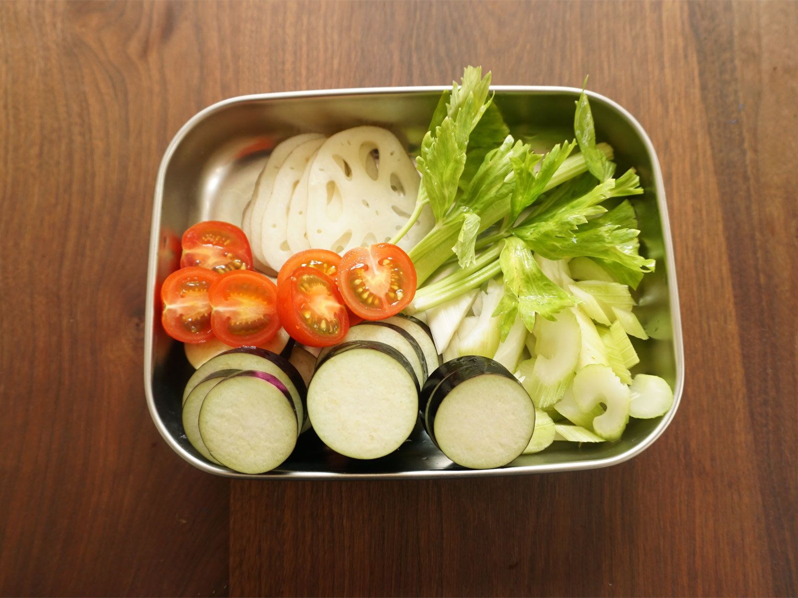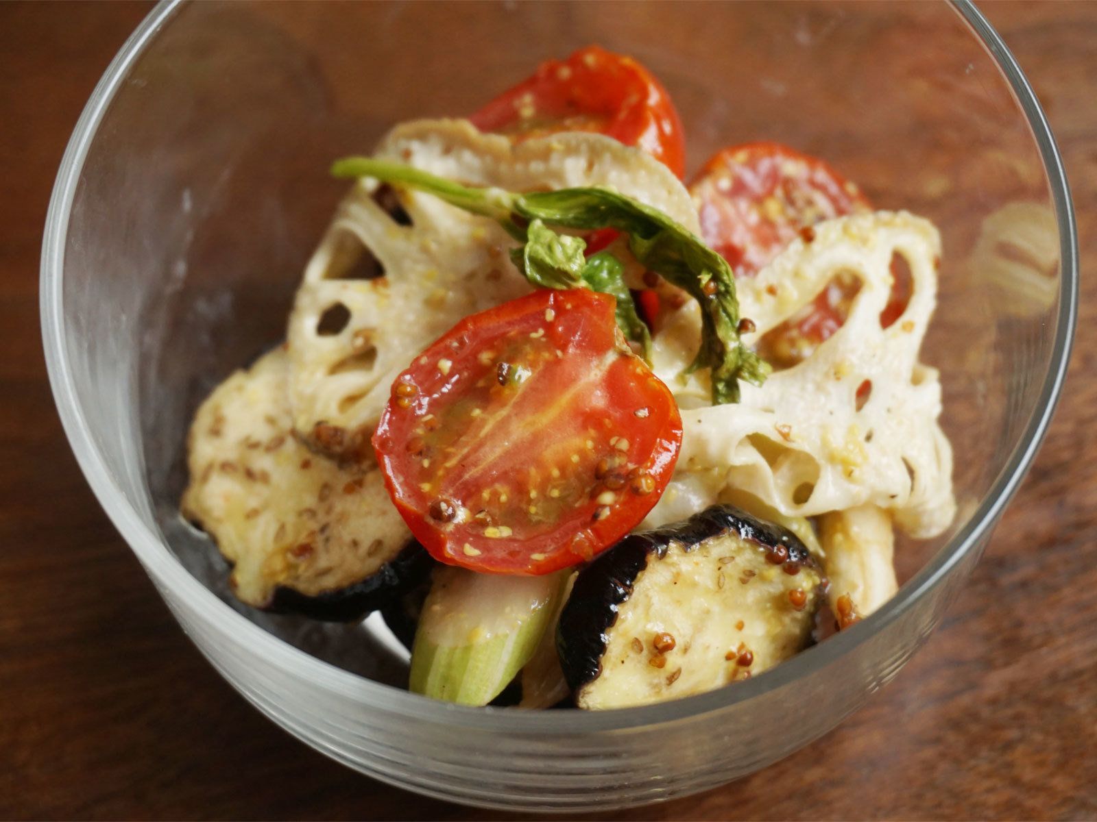 干し野菜(ナス・レンコン・セロリ・ミニトマト あわせて50g程度)を水につけて10分程度戻します。酢(大さじ2)、オリーブオイル(大さじ1)、粒マスタード(大さじ1)、砂糖(小さじ1)、塩こしょう(各少々)をよく混ぜ合わせてマリネ液を作り、水気を絞った干し野菜にからめたら、できあがり。