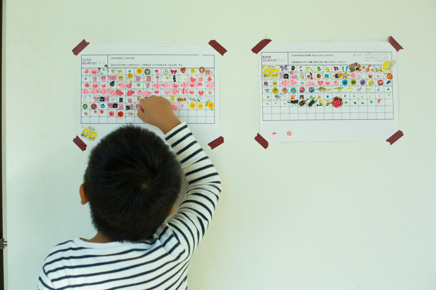 保育園や小学校の準備は、「できたらシールを貼る方式」を採用。シールを貼るたびに達成感が得られるらしく、子どもが進んでやるように。任せることで、ママがゆっくりする時間が生まれました。