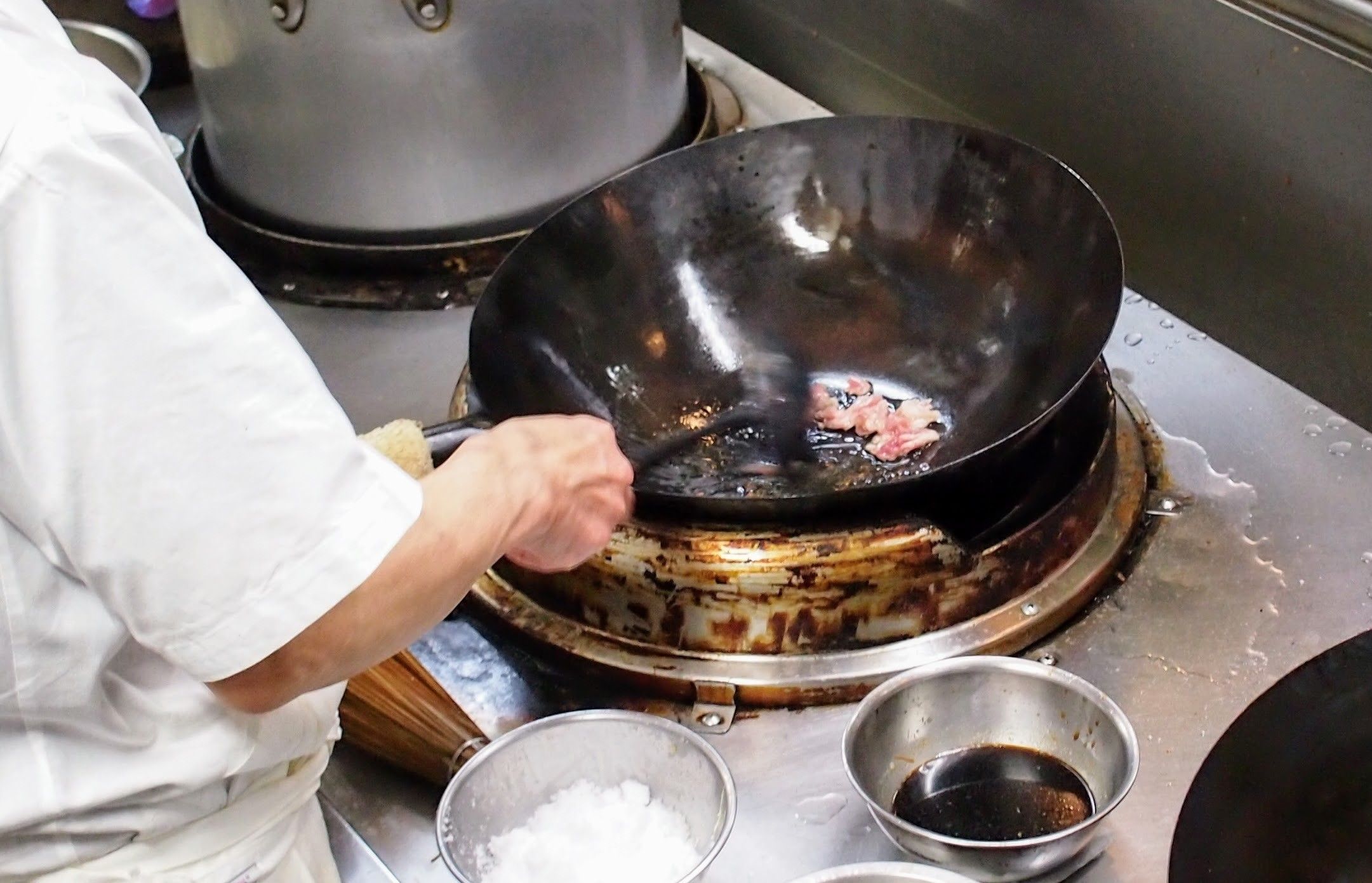 鉄のフライパンでは肉がくっついてしまわないか心配ですよね。でも、プロのみなさん共通の焼き方がありました。それは少し多めの油をフライパンに入れて強火で焼くこと。油がなじんだら余計な油はオイルポットに戻します。そしてさらに火を入れ、黒い煙が出たところで肉を入れます。入れたら、しばらく肉を動かさないのがポイントです。
