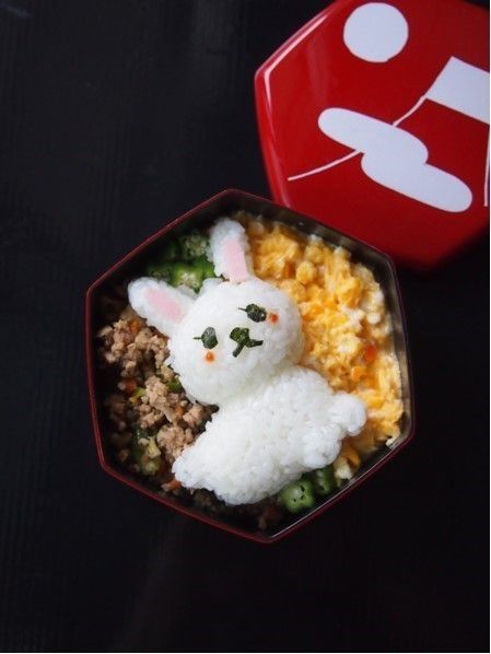 いつもの3色丼は、ごはんの上にそぼろなどをのせますが、逆に盛りつけにトライ!おかずの上に、立体ごはん型で作ったウサギをのせます。少し先ですが十五夜にもピッタリなデコ。ちなみに今年は9月24日中秋の名月です。