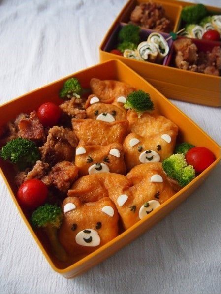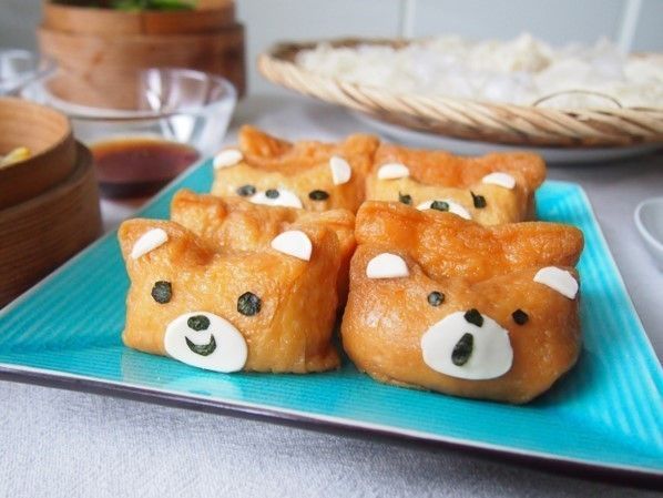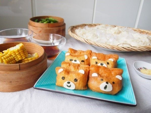 夏のお昼ご飯の定番と言ったらそうめん!一緒にキュートなクマさんお稲荷も出せば、テーブルの上が楽しい雰囲気になります。くまちゃんの表情も様々にすると作っている時から楽しい気分に。