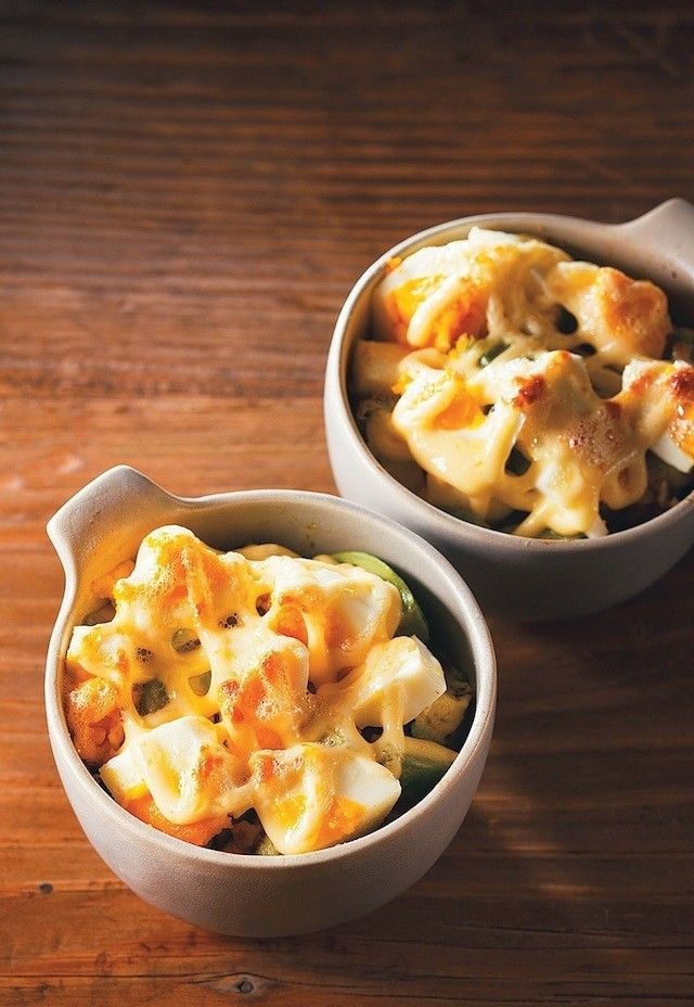 2、1 を合わせてココット型に入れ、塩、こしょうをふり、マヨネーズをしぼる。トースターでこんがりと5~6分焼く。